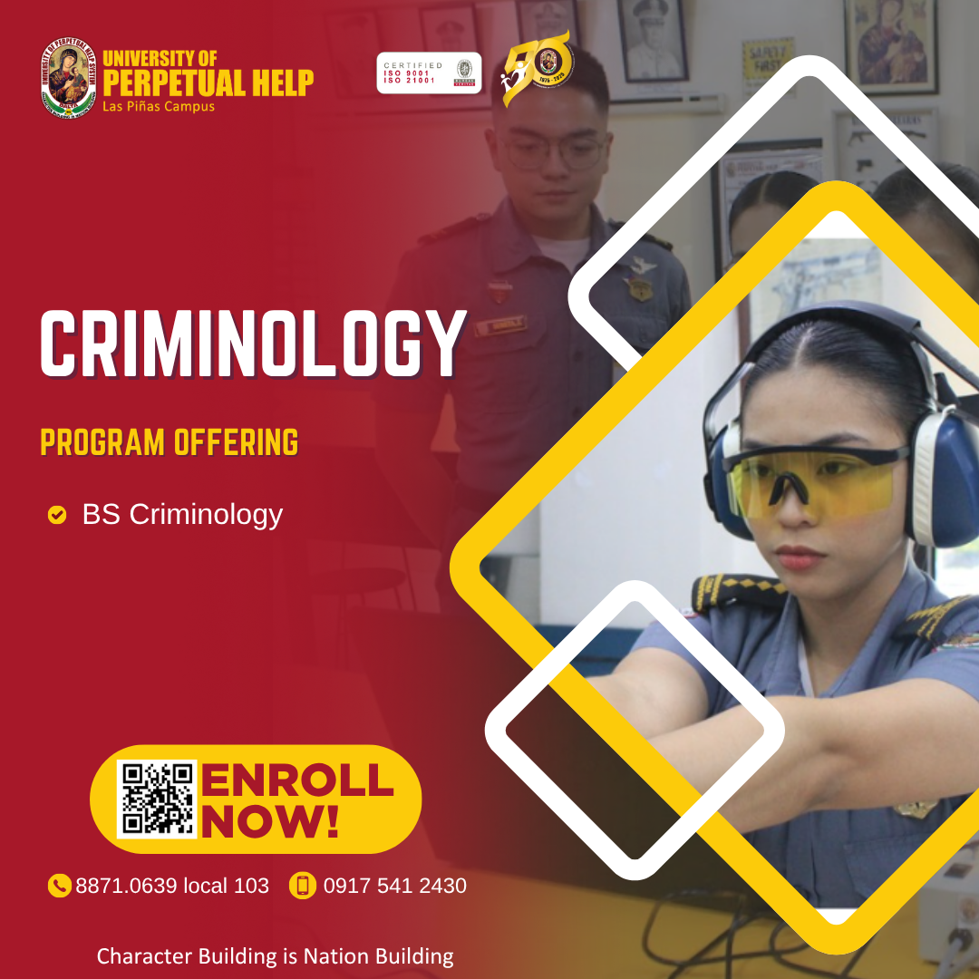 The College of Criminology aims to produce graduates imbued with technical skills and knowledge in the field of law enforcement, public safety, industrial security and social defense, coupled with a deep sense of loyalty to God, country, people, and Alma Mater.