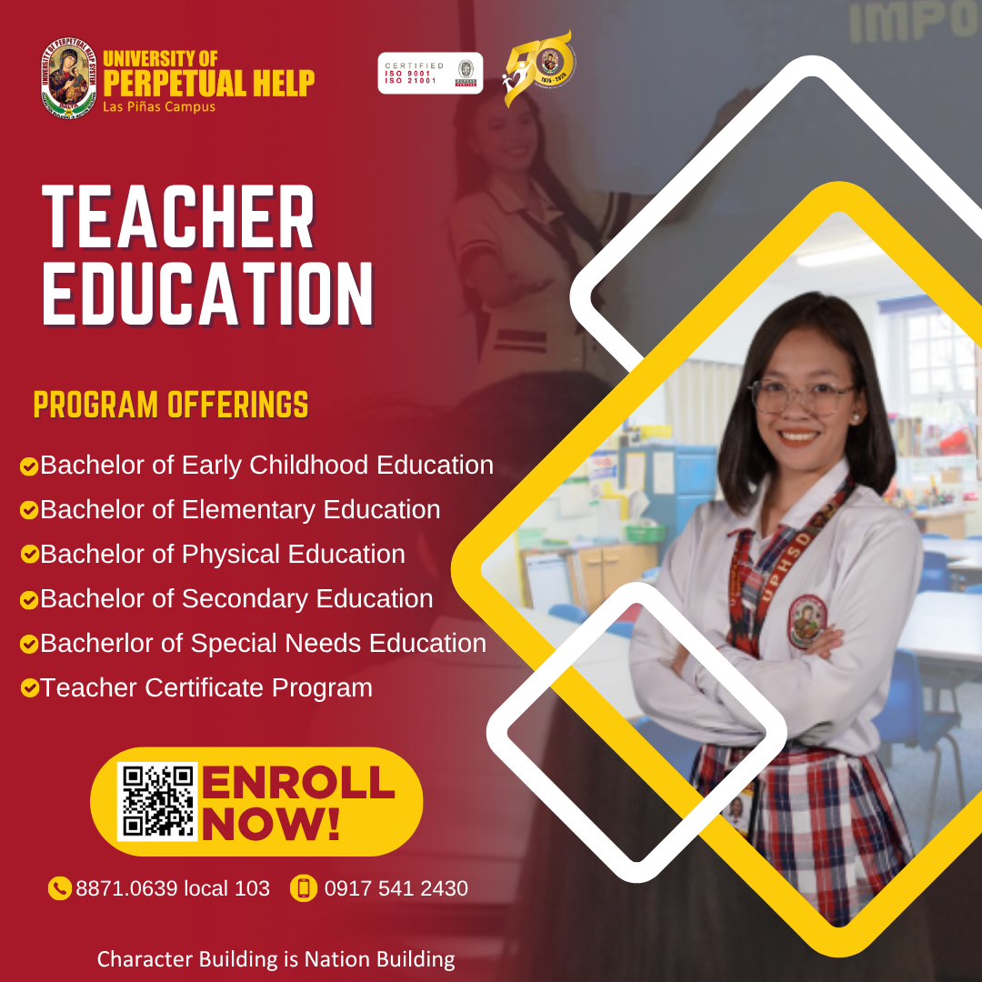 The University of Perpetual Help System DALTA College of Education is dedicated to develop future teachers of excellence and integrity with the skills necessary to explore and pursue solutions to current education issues and concerns. The curriculum provides many opportunities for classroom observation, projects, student teaching internships, and community engagement programs under the guidance of our nurturing and highly qualified faculty and staff. We strive to prepare our graduates to pass the Licensure Examination for Teachers and to become effective educators ready to meet any challenge with compassion, wisdom, and strength of character to excel in the dynamic and evolving field of education.